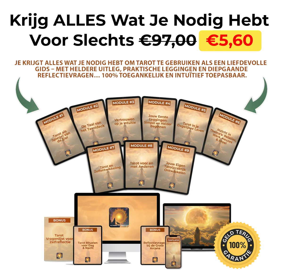 Normaal gesproken betaal je €97,00 voor de volledige bundel. Maar omdat we momenteel een speciale campagne doen om ervaringen en waardevolle recensies te verzamelen, krijg je tijdelijk toegang voor slechts €5,60. Deze actie is bedoeld om zoveel mogelijk mensen kennis te laten maken met tarot op een laagdrempelige, veilige en intuïtieve manier. Let op: deze symbolische prijs is tijdelijk – dus als je voelt dat dit resoneert, wacht dan niet te lang.